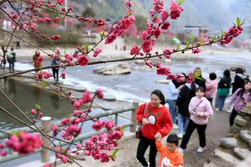 2月23日,在城步苗族自治县丹口镇桃林村,前来观赏桃花的游客络绎不绝。(摄影/严钦龙)