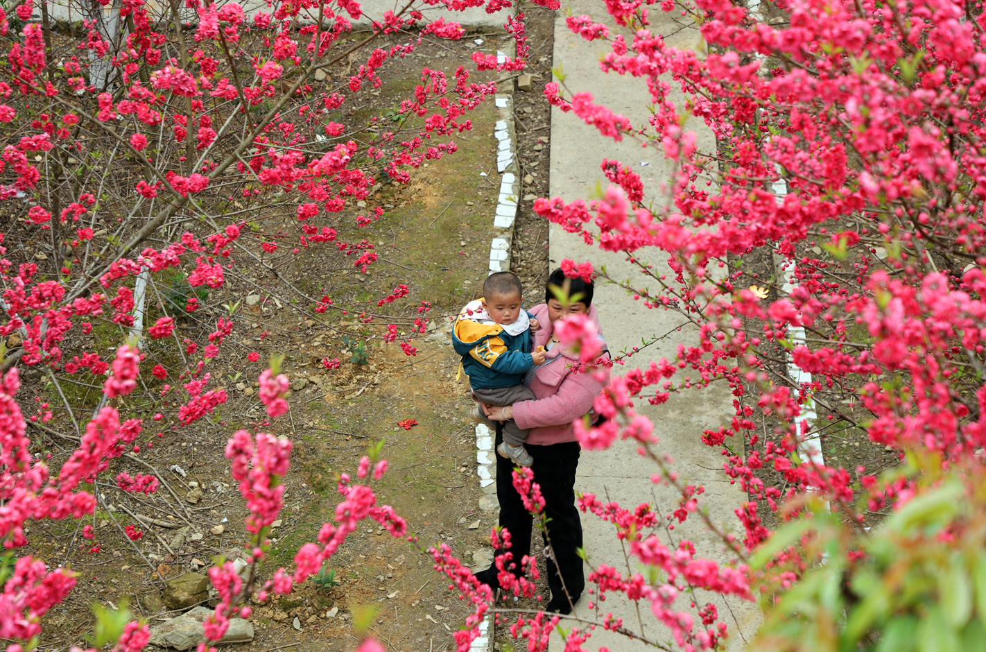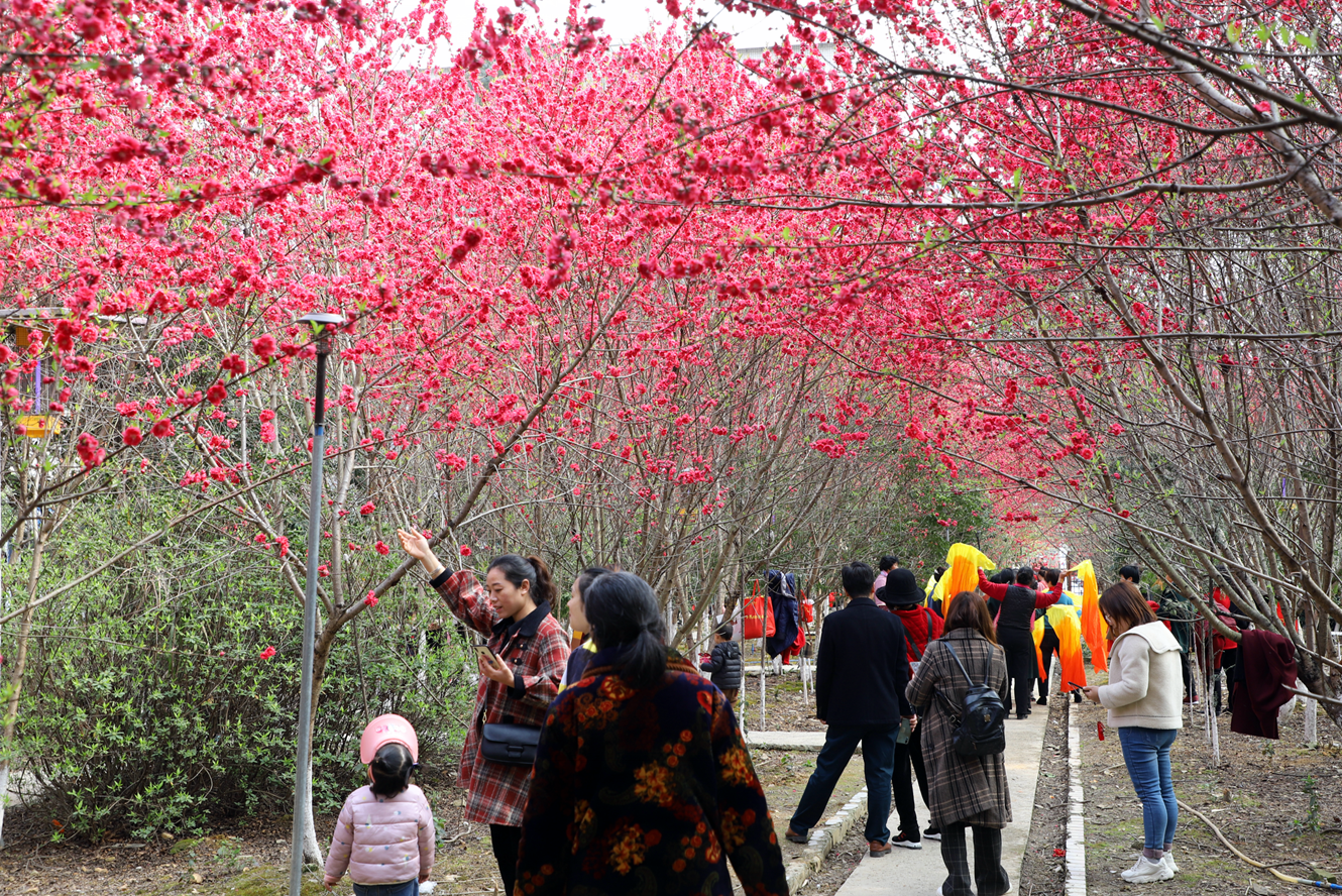 近日,绥宁县城绿洲电站里的桃花盛开,迎来了一批批踏春人。只见大家穿着亮丽的服装和配饰,或手抱婴儿;或牵手亲友,三三两两地簇拥在艳红的桃树下,赏花、留影、谈笑,给过往的人们送了一幅幅美丽的迎春图。(摄影/杨继军)