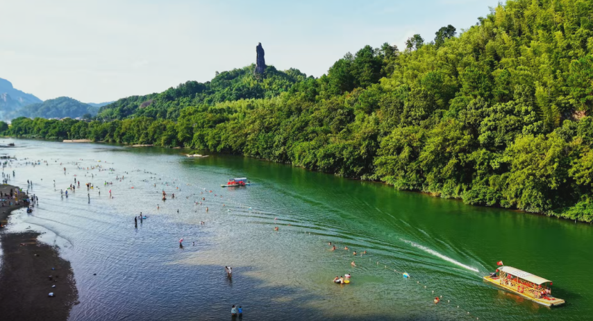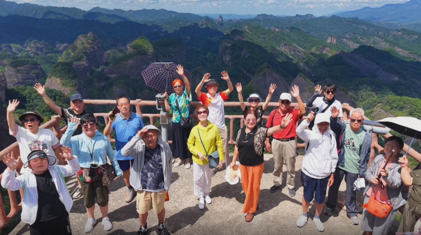 在夫夷江景区,团队游客们乘坐漂流舟顺流而下,沿岸青山如画,碧水悠悠,清风扑面而来,欢声笑语不断。来到辣椒峰景区,赫然矗立的赤红色峰体如一只指向苍穹的巨椒,大家纷纷合影留念,记录下这难忘的瞬间。随后,他们乘坐缆车登临八角寨,俯瞰群峰竞秀,红岩丹霞宛如彩霞铺展,奇峰怪石令人叹为观止。山水相映、人景交融,崀山的独特魅力让远道而来的宾客流连忘返。
