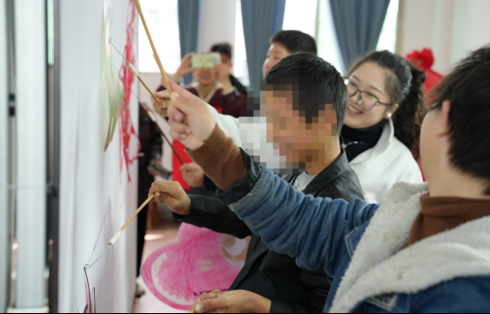 志愿者手把手教特殊儿童操作皮影偶