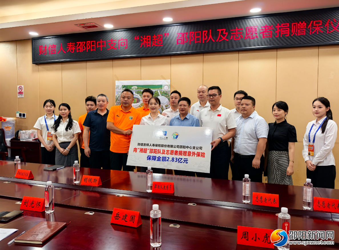 最后,进行了捐赠环节并合影留念。财信人寿邵阳中支向“湘超”邵阳队及相关人员捐赠意外保险,保障金额达2.83亿元。此次捐赠仪式,不仅为“湘超”邵阳队及相关人员提供了坚实保障,也彰显了政企携手共促体育事业发展的良好态势,为邵阳市体育事业的蓬勃发展注入新动力。