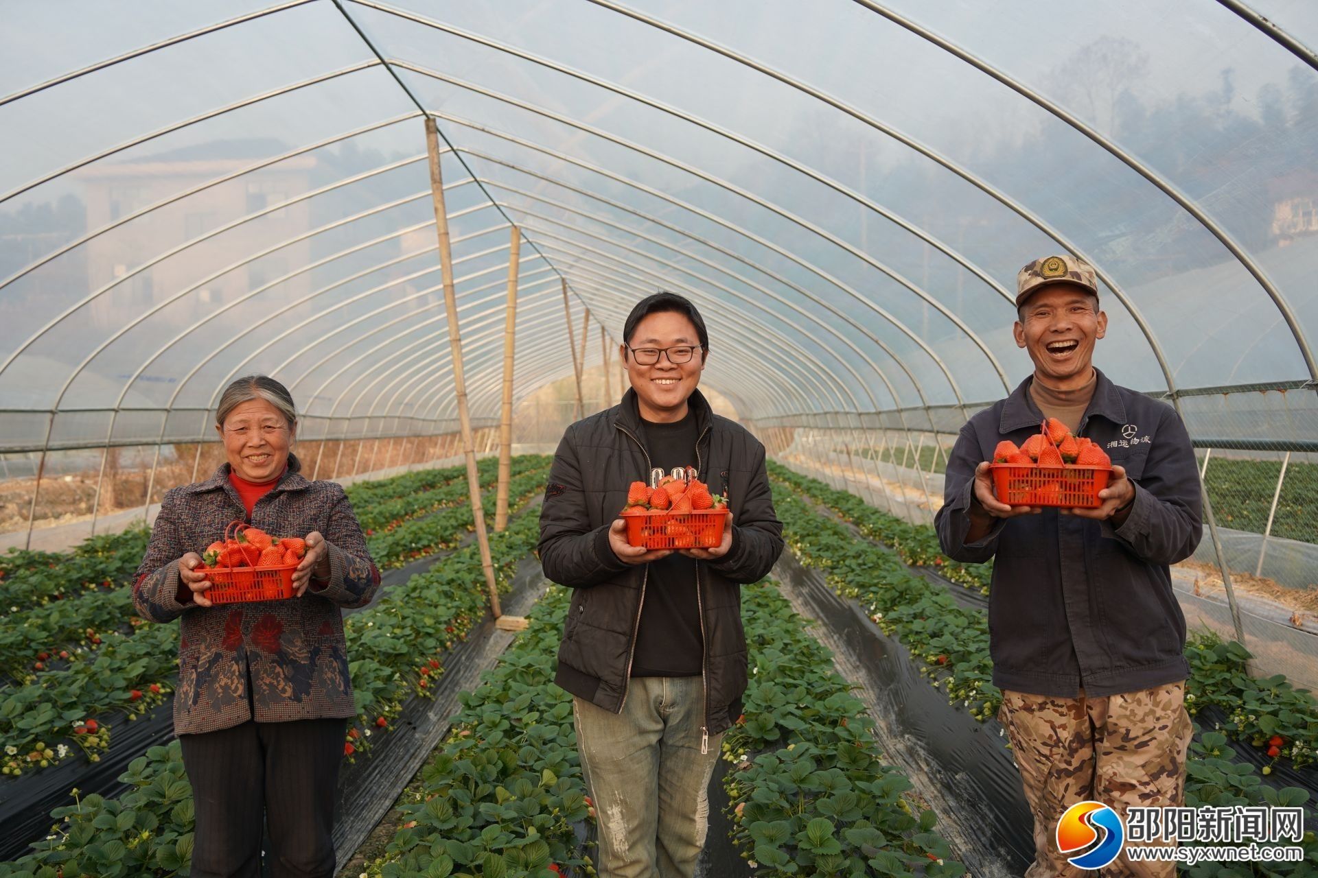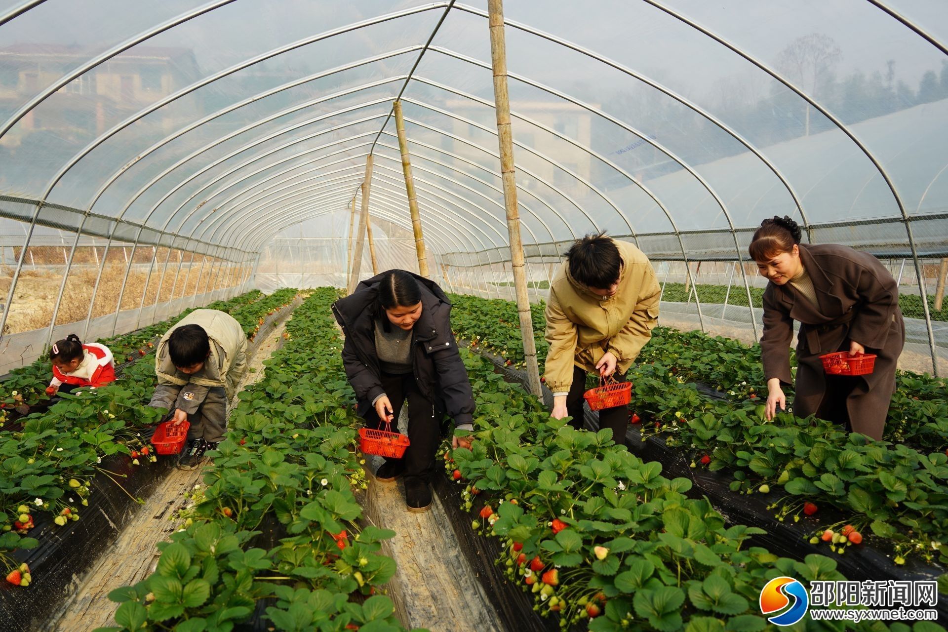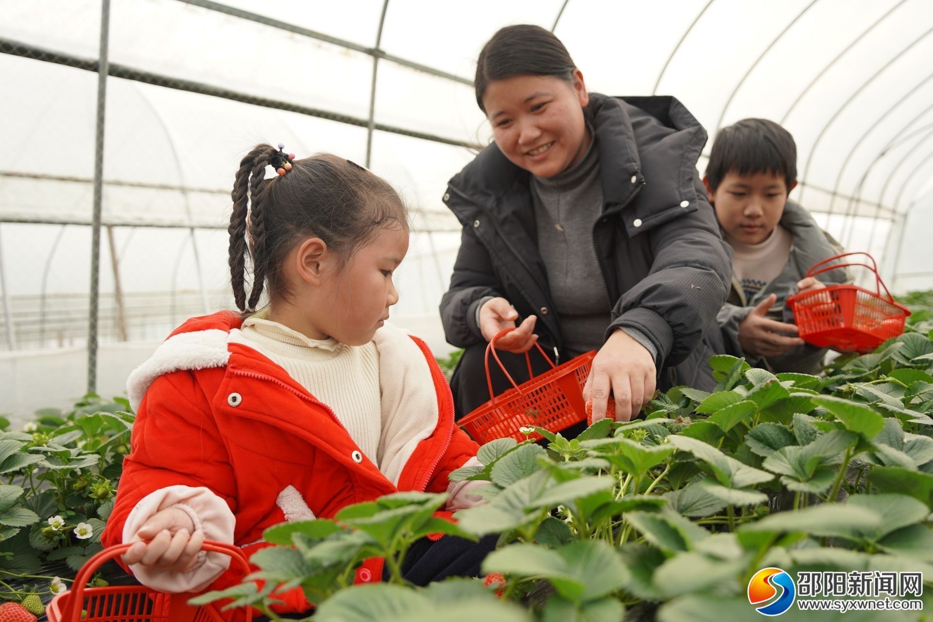 1月5日,走进绥宁县关峡苗族乡插柳草莓园,宽敞明亮的大棚里,浓郁的果香扑面而来,放眼望去,一垄垄草莓植株整齐排列,红艳娇嫩的草莓如同点缀在绿叶间的宝石,长势喜人,让人垂涎欲滴,不少游客穿梭其中采摘,享受着甜蜜的“莓”好时光。