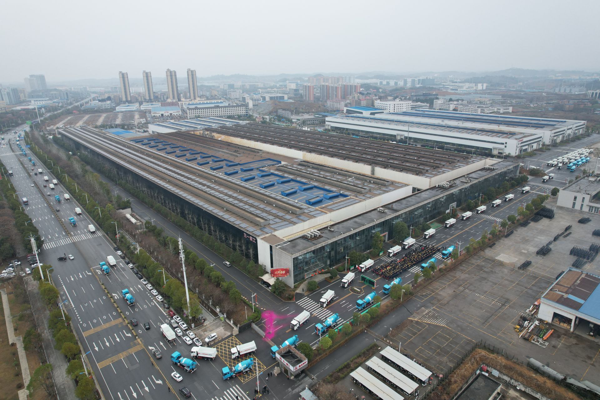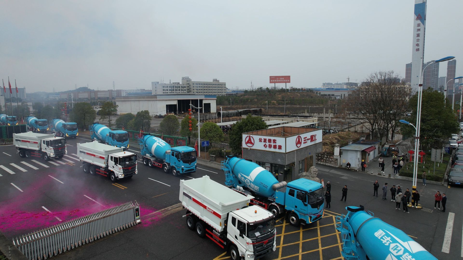 当天上午8时许,三一专汽公司高管和职工早早来到工厂,个个精神抖擞,满心期待开工和发车仪式。在发车区,各式搅拌车、自卸车依次排列、气势恢宏,就像整装待发的钢铁战士,尽显三一专汽强大的制造能力。