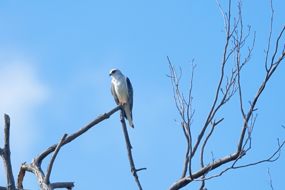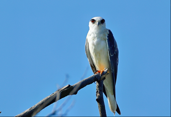黑翅鸢是鹰科鸢亚科黑翅鸢属我国分布的唯一种,属于小型猛禽,成鸟体长约33厘米。嘴黑色,脚黄色,虹膜红色。前额白色,到头顶逐渐变为灰色,眼周有黑斑,像戴了佐罗眼罩。喉部、腹部白色,后颈、背、肩、腰,一直到尾上覆羽蓝灰色。翼中有长条状黑色斑块,翼尖黑色,飞行时可见。