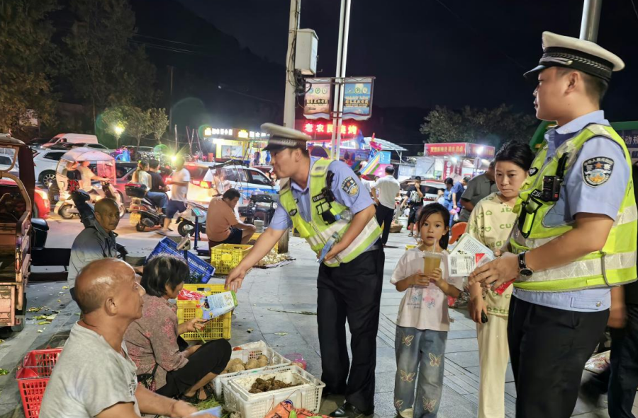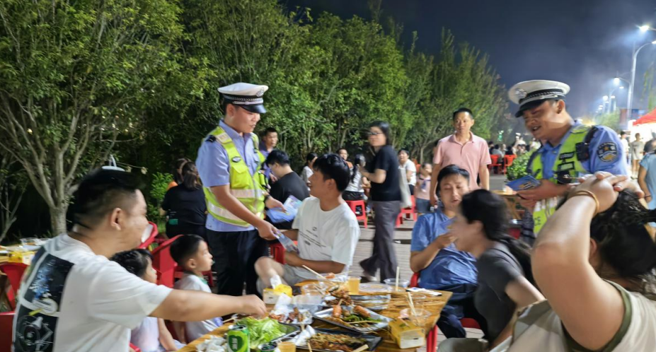 当晚8时,夫夷江畔的夜市人声鼎沸。在一处烧烤摊前,民警刚翻开宣传手册准备讲解,正在聚餐的张大叔主动“抢过话头”。他撸起袖子,露出手臂上的伤疤,向众人讲述亲身经历:“前年我喝了两杯酒骑摩托,结果摔得头破血流,还撞了人。现在我吸取教训,头盔天天戴,喝酒绝不碰车!”这番真诚的分享,引得众人纷纷点头。一旁卖青菜的奶奶也凑过来,道出自己的担忧:“小伙子,我眼神不好,晚上过马路总怕被撞。”民警立刻耐心回应:“奶奶,您过马路要‘慢一步’,走人行横道,最好穿亮色衣服,做到一看、二慢、三通过。”这样双向的交流互动,让交通安全知识深入人心。