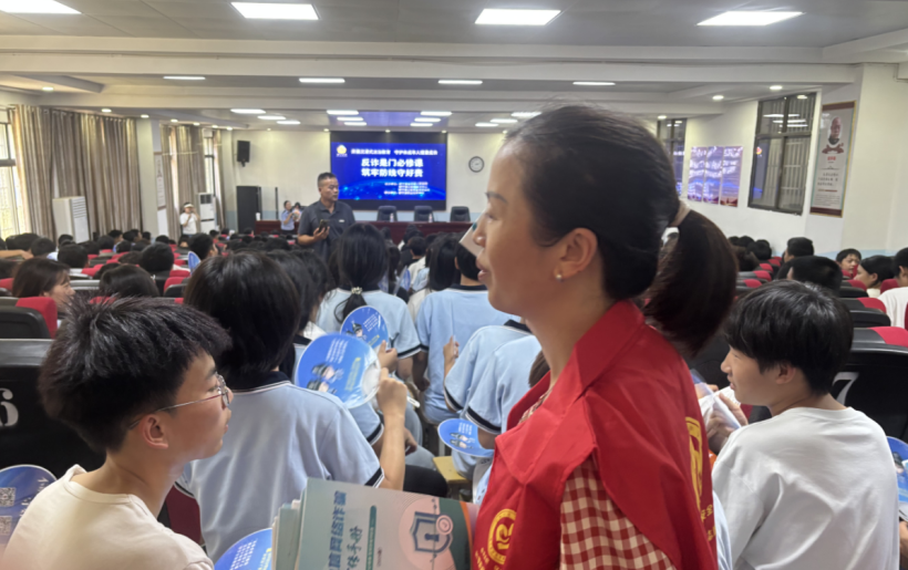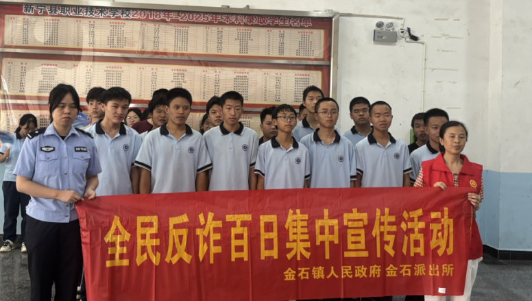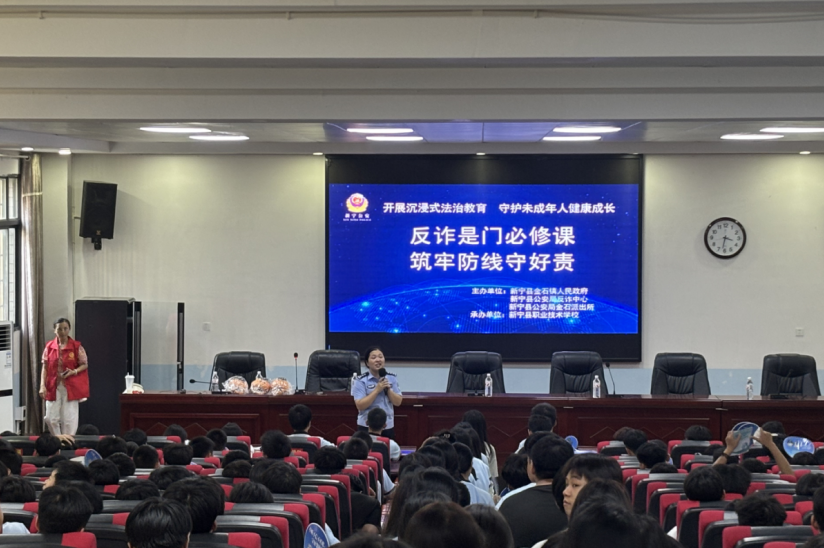 邵阳新闻网10月11日讯(通讯员 戴红卫)10月11日,一场别开生面的“全民反诈百日集中宣传”活动在新宁县职业技术学校举行。本次活动由新宁县金石镇人民政府牵头,联合新宁县公安局反诈中心与金石镇派出所共同举办,为该校高一年级12个班的800余名师生带来了一堂生动而深刻的“法治必修课”,旨在通过沉浸式教育,提升青少年的反诈防骗能力,守护未成年人健康成长。
