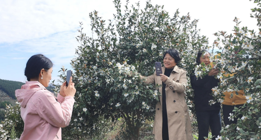 “满山遍野的油茶花清新素雅,空气中弥漫着甜甜的清香,特别治愈。”来自县城的游客黄百合兴奋地说,“今天和几个姐姐一起来看油茶花,真的太惊喜了!我们拍了很多美照,要把这份美好分享给更多朋友。”
