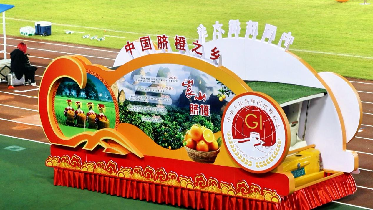 与此同时,一辆精心装饰的花车缓缓驶入球场。花车上,崀山丹霞地貌微缩景观栩栩如生,金黄的脐橙挂满枝头,身着民族服饰的演员载歌载舞,将新宁的自然风光、特色产业和民族文化巧妙融合。花车所到之处,观众纷纷举起手机记录美好瞬间。