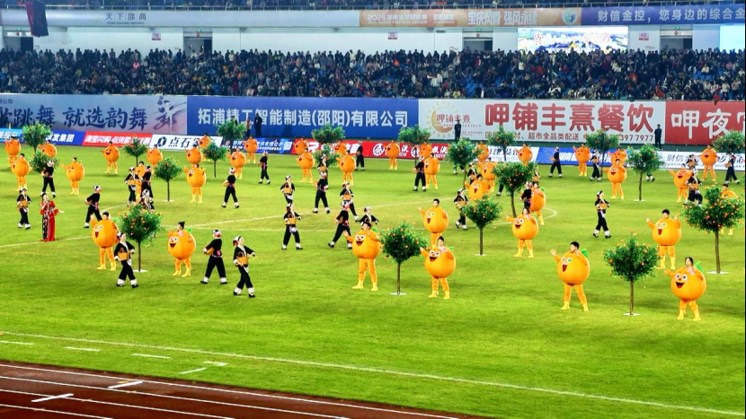 中场休息时,一场以新宁脐橙为主题的创意歌舞表演在球场中央上演。演员们身着橙色服饰,有的装扮成饱满的脐橙,有的身着瑶族传统服饰,用灵动的舞姿和活力满满的歌声展现了新宁脐橙丰收的喜人场景。