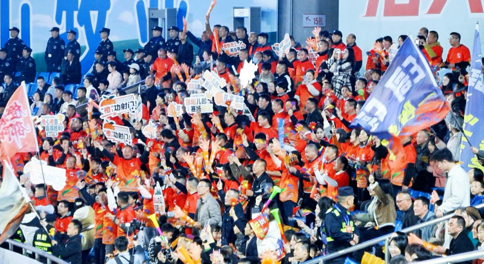 看台上,新宁助威团身着统一橙色服装,手持“崀山巍巍铸队魂”、“脐橙甜甜润心田”等标语牌,挥舞旗帜,用整齐划一的口号为邵阳队加油鼓劲。