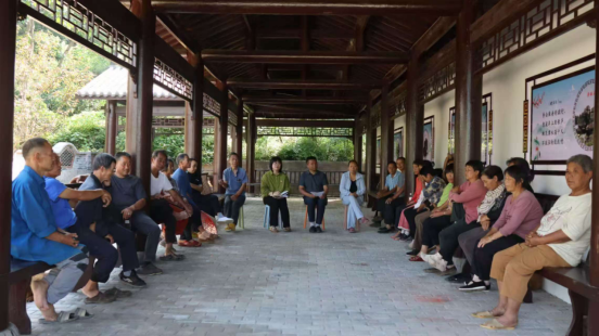 阳艳姣和乡风文明劝导队成员一起组织群众召开乡风文明恳谈会