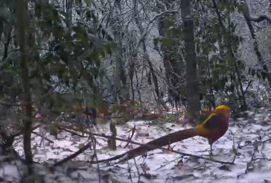 紧随其后,“林中贵族”红腹锦鸡憨态可掬地现身。它羽色艳丽夺目,绯红的腹部与金黄的背羽在白雪映衬下愈发鲜亮,修长的尾羽随着跳跃动作轻轻摇曳,每一步都尽显华贵姿态,成为雪地中最耀眼的“主角”之一。此外,红外相机还捕捉到偶蹄目鹿科麂属的黄麂在雪中觅食的温馨场景,它低头探寻食物的模样灵动可爱,与皑皑白雪相映成趣,构成了一幅和谐共生的生态图景。