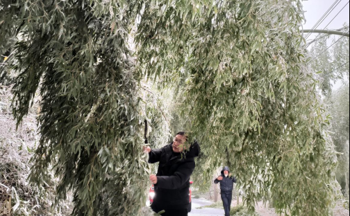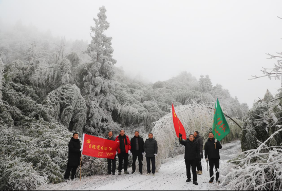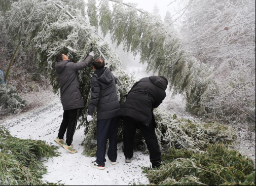 近日,舜皇山保护管理站站长带领党员干部组成应急队伍,携带砍刀等工具,顶风冒雪赶赴各险情路段。现场,倒伏的毛竹与断枝纵横交错,占据了大部分路面。队员们分工协作,默契配合:砍刀手负责切割粗大的竹竿,其他人则迅速将断枝残叶清运至路旁。对于被积雪压弯却未折断、悬于道路上方的竹子,一位队员冒着刺骨的寒冷拖住竹尖,另一位队员奋力砍掉竹尖,使其直立起来,消除潜在隐患。寒风凛冽,大家双手冻得发僵,但抢修工作紧张有序。