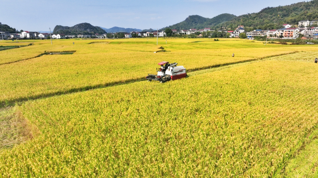 ▲邵阳晚稻收割场景。(图源:央广网)