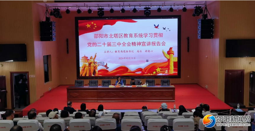 邵阳新闻网10月12日讯(通讯员 唐甜)10月11日,北塔区教育系统在芙蓉学校多功能报告厅举办学习贯彻党的二十届三中全会精神宣讲报告会,全区教育系统100余名人员参加学习。
