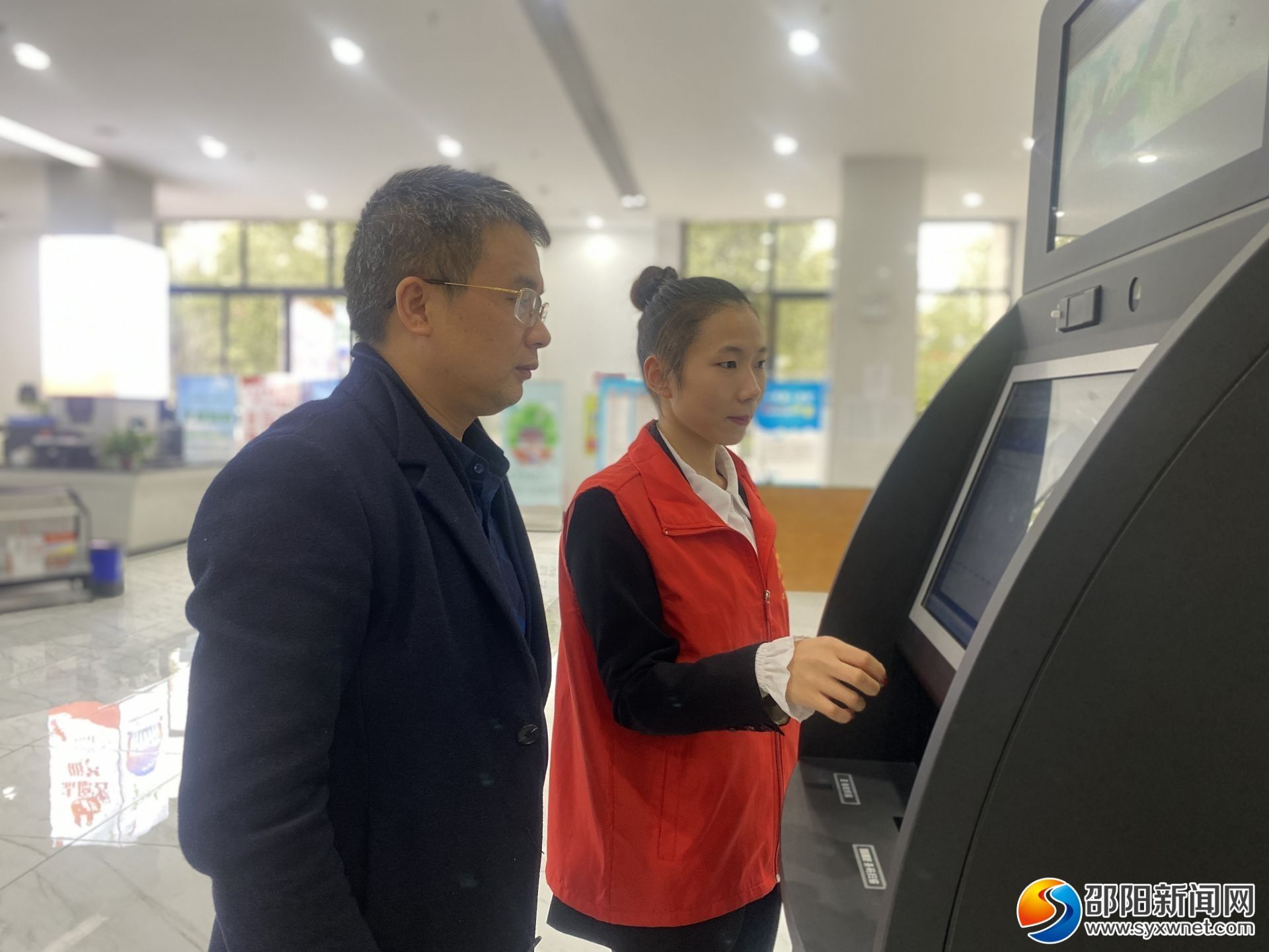 营业大厅的志愿者正在指引市民操作智能设备。