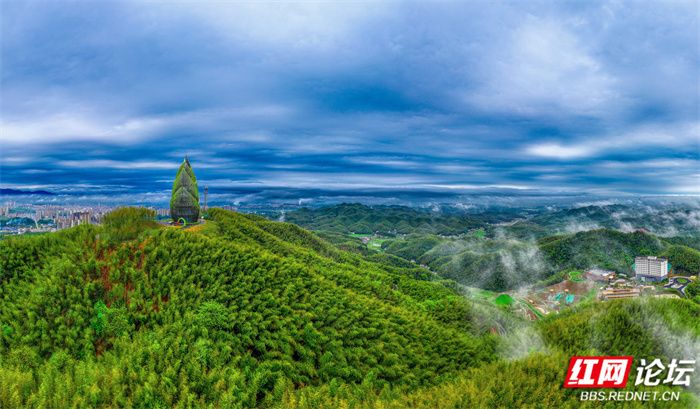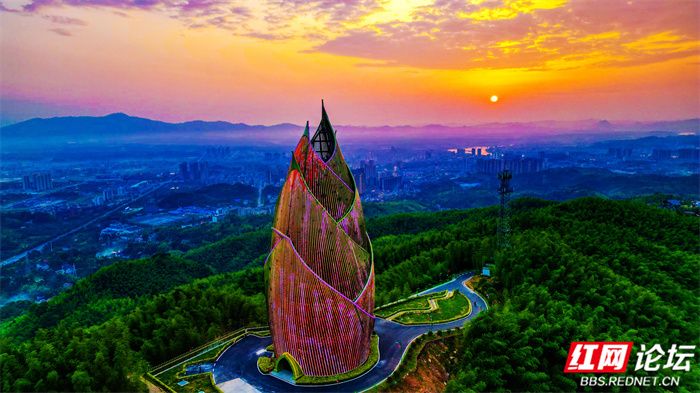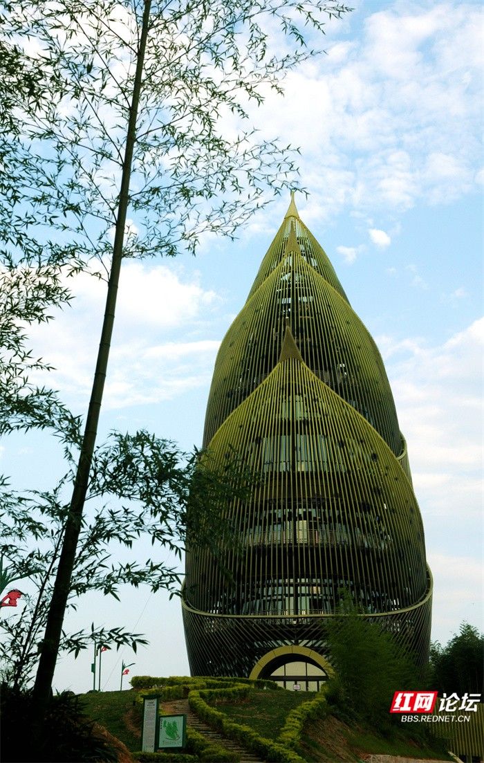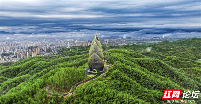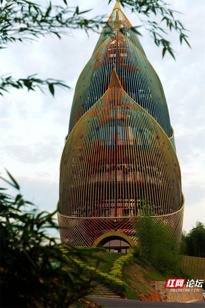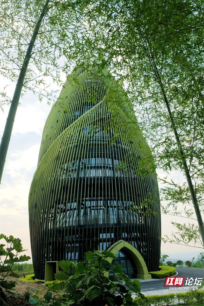▲图说:桃江县桃花江竹海景区内的“大竹笋”的造型设计灵感来自于“春笋破土”的动态形象。由6片笋叶组成,高57米,是一座集观景、森林防火、通讯等功能于一体的景观瞭望塔。包括地下一层和地上四层,首层为门厅、集散大厅及服务区。登上笋塔可俯瞰整个桃花江竹海,感受翠竹连绵,坡坡泛绿波,竹荫涛声,百鸟和鸣。山间清新的空气让人心旷神怡。