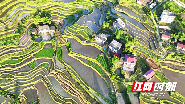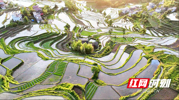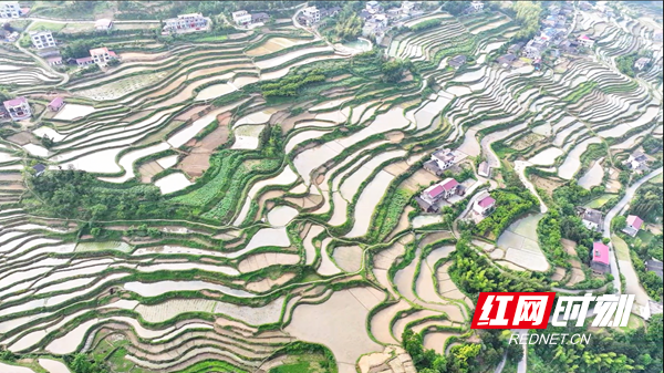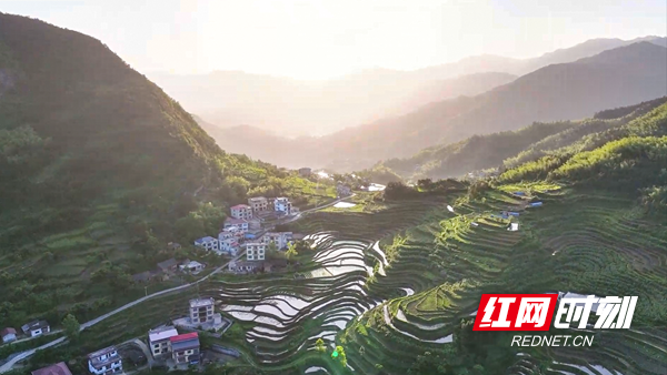 青山环抱着梯田,乡村点缀其间,飘逸灵动,如诗如画,共同构成一幅生态和美的乡村振兴新画卷。