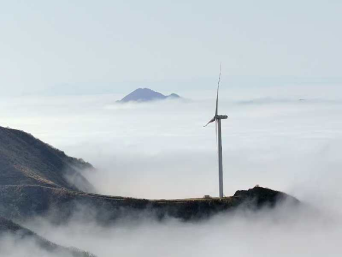 极目远眺,随着微风的吹拂,云海开始缓缓涌动、翻滚、舒展。时而,云雾缭绕,风车的身影被完全吞没,只留下叶片转动时的轮廓在云海中若隐若现,好似海市蜃楼。