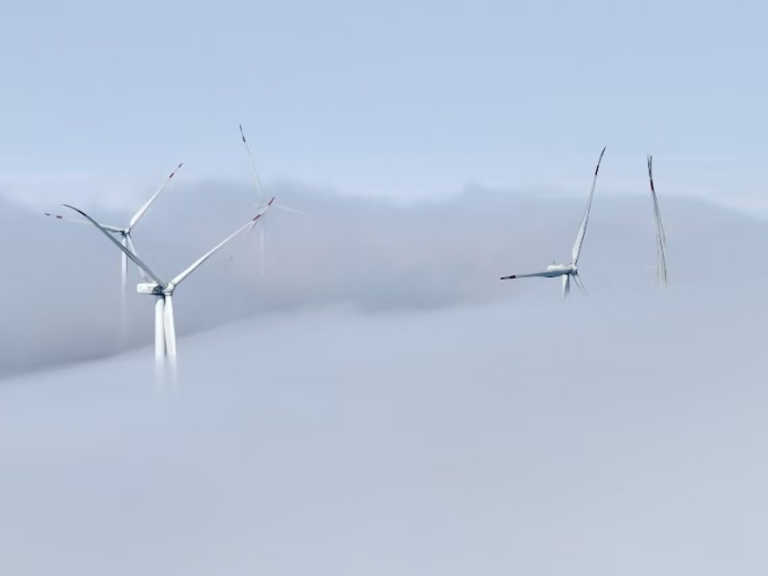 在晨光的温柔抚摸下,山峦被雾气笼罩,仿佛是大自然织就的一件洁白纱幔,披盖在连绵的山峦之上,与蓝天相接,形成了一道动人的天际线。风车在蓝天的背景下,显得格外醒目,叶片在晨风中缓缓转动,仿佛是天地间的舞者,与蓝天共舞,与大地相依。