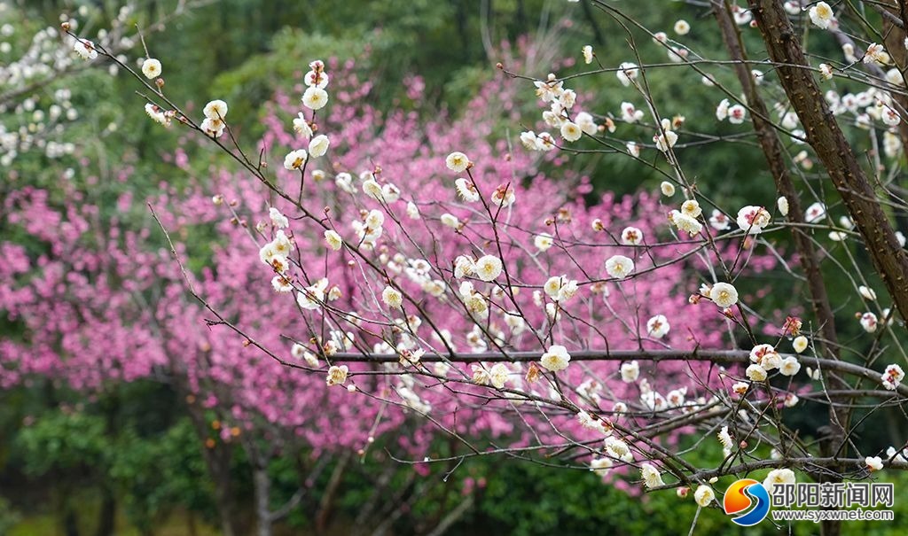 粉色、白色梅花争相斗艳