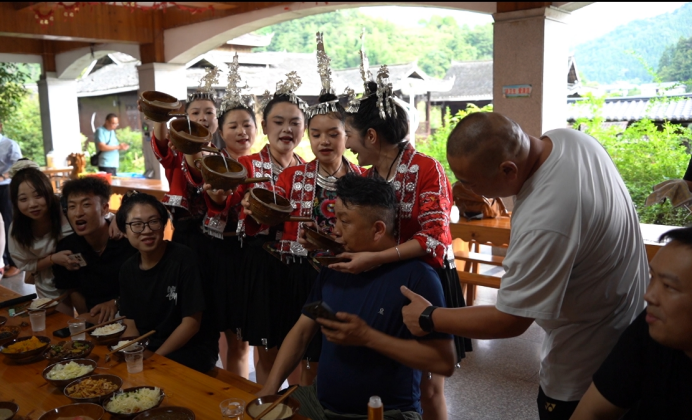 晚宴时分,长龙宴正式开场。数十张桌子紧密相连,摆成一条的“长龙”,上面摆满了琳琅满目的特色美食,让人垂涎欲滴。身着盛装的苗家姑娘们穿梭席间,为游客们斟满米酒,唱起动听的敬酒歌,开启了热闹的敬酒环节。她们身姿轻盈,笑容明媚,每到一桌便唱起自编的敬酒歌,双手捧着酒碗敬向游客。按照苗家规矩,敬酒时要用双手接碗,喝酒时姑娘会轻轻晃动酒碗,寓意“酒满情深,情谊绵长”。