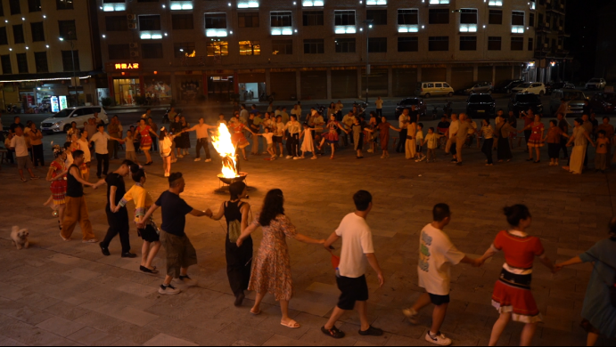 夜幕降临,黄桑小镇灯火璀璨,一场名为“黄桑夜曲·星火派对”的民俗演出热闹开场,来自湖北的游客团欢聚于此。来自黄桑本地的舞蹈《高山流水》则是当晚的一大亮点,舞者们以肢体语言演绎着绥宁山水的灵秀与豪迈,将当地人与自然和谐共生的意境展现得淋漓尽致,仿佛将黄桑的清泉与山峦搬上了舞台。最让游客们兴奋的当属互动环节。非遗节目《竹竿舞》表演中,身着民族服饰的演员们随着竹竿的开合跳跃,动作整齐划一、轻盈灵动。随后,游客们被热情邀请上台参与,大家时而跳跃时而躲闪,现场笑声、欢呼声不断;集体篝火舞环节更是将演出推向高潮,游客与当地群众手拉手围成圆圈,在熊熊燃烧的篝火旁翩翩起舞,火光映照著每个人的笑脸,歌声与掌声在夜空中回荡,此刻,湘鄂两地的情谊在欢声笑语中悄然升温。游客们在歌舞与互动中深度感受绥宁浓郁的地域文化少数民族风情,为“探秘湘西南”之旅增添了一抹热烈而难忘的色彩。