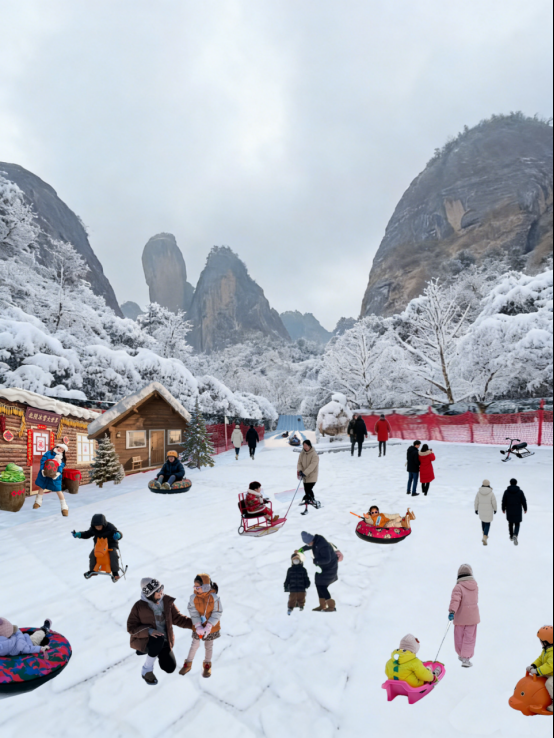 “辣椒峰”以赤红色丹霞巨石形似倒立辣椒得名,2002年因法国“蜘蛛人”徒手攀爬而名扬世界,其雄奇险峻的地貌与晶莹冰雪形成强烈视觉碰撞,成为冬日崀山的全新打卡地标。此次全新亮相的冰雪乐园,打破传统赏雪模式,将5000㎡空间打造成集观赏、互动、探险于一体的欢乐场:雾凇步道上,冰晶缀满枝头,与丹霞岩壁相映成趣,步步皆是童话景致;冰雪小屋内,热饮氤氲伴雪落之声,氛围感拉满;亲子嬉雪区里,堆雪人、打雪仗的欢声笑语,重拾纯粹童真。对于追求刺激的游客,雪圈滑道俯冲而下的风驰电掣、雪地摩托专属赛道的驰骋快感,搭配雪橇、地形车、雪地碰碰球等十余种项目,全方位刷新“玩雪”想象。