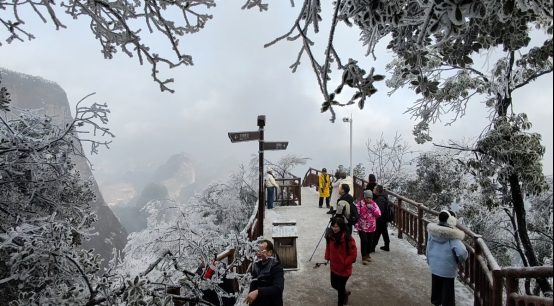 作为崀山冬季“限定美景”,八角寨的雾凇、雪景与云海以其独特性备受青睐。据景区工作人员介绍,每年12月下旬至次年2月,高海拔的八角寨易形成雾凇景观,雨后初晴时更易邂逅云海,“丹霞+冰雪+云海”的三重组合堪称大自然的馈赠 。为保障游客安全舒适游览,景区提前做好应急预案,在栈道铺设防滑垫、设置安全警示标识,同时增设热饮补给站、提供防滑设备租赁服务,“微笑新宁”志愿者们在关键点位提供引导咨询,让游客在赏景之余感受暖心服务。