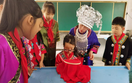 融合非遗,让文化传承“潮”起来。该县打好“融合拳”,邀请苗绣传承人走进校园,手把手教授少先队员传统苗绣技艺。孩子们以针为笔、以线为墨,将象征革命和光荣的少先队队旗图案绣制出来。一针一线间,苗绣这项古老的非遗焕发新的生机,少先队的光荣传统在指尖的传承中深深烙印在孩子们心中,实现了红色教育与民族文化传承的双向赋能。