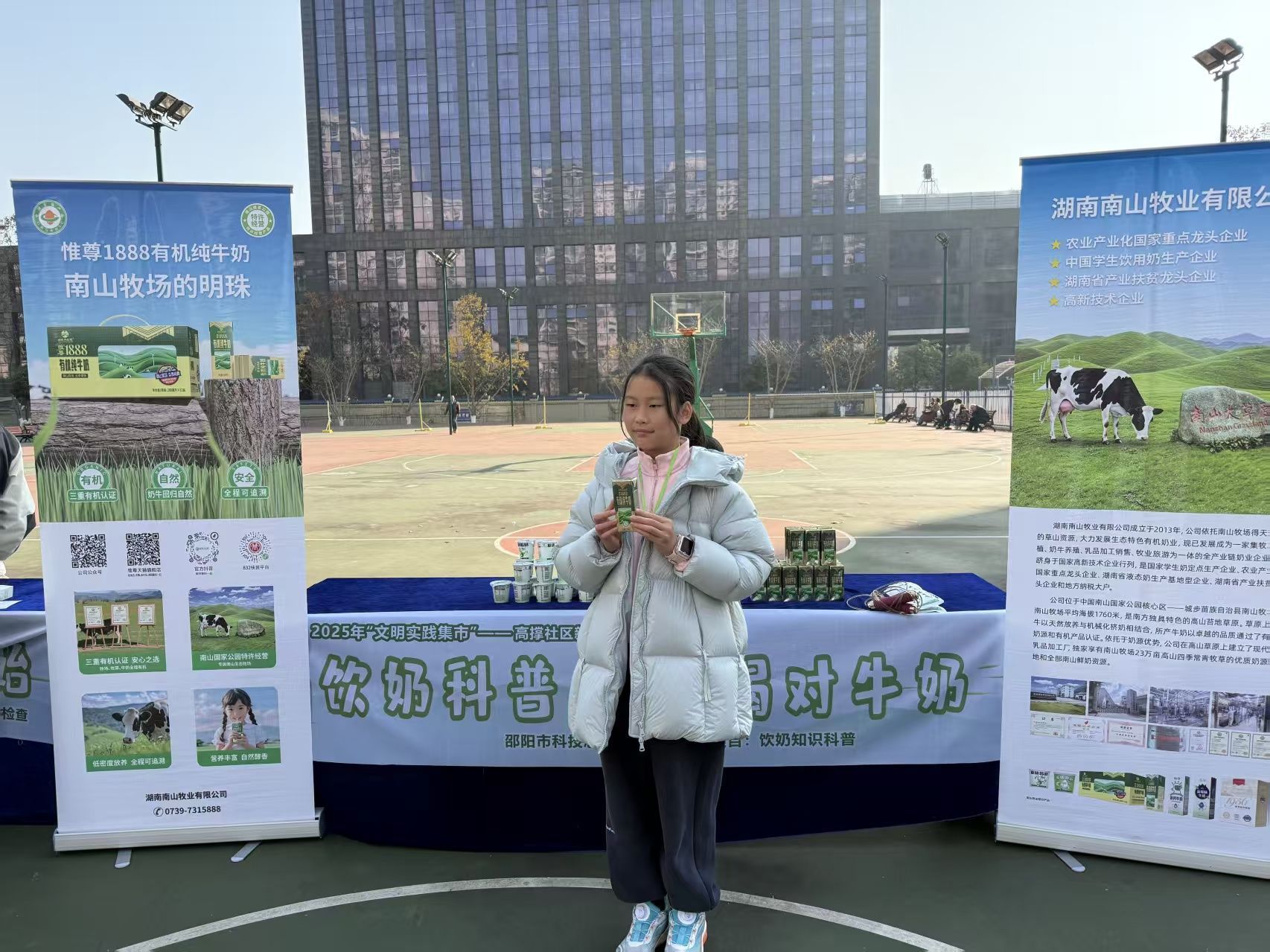 “饮奶科普”摊位前,志愿者通过图文展板和互动问答向居民传递科学饮奶与营养均衡知识。