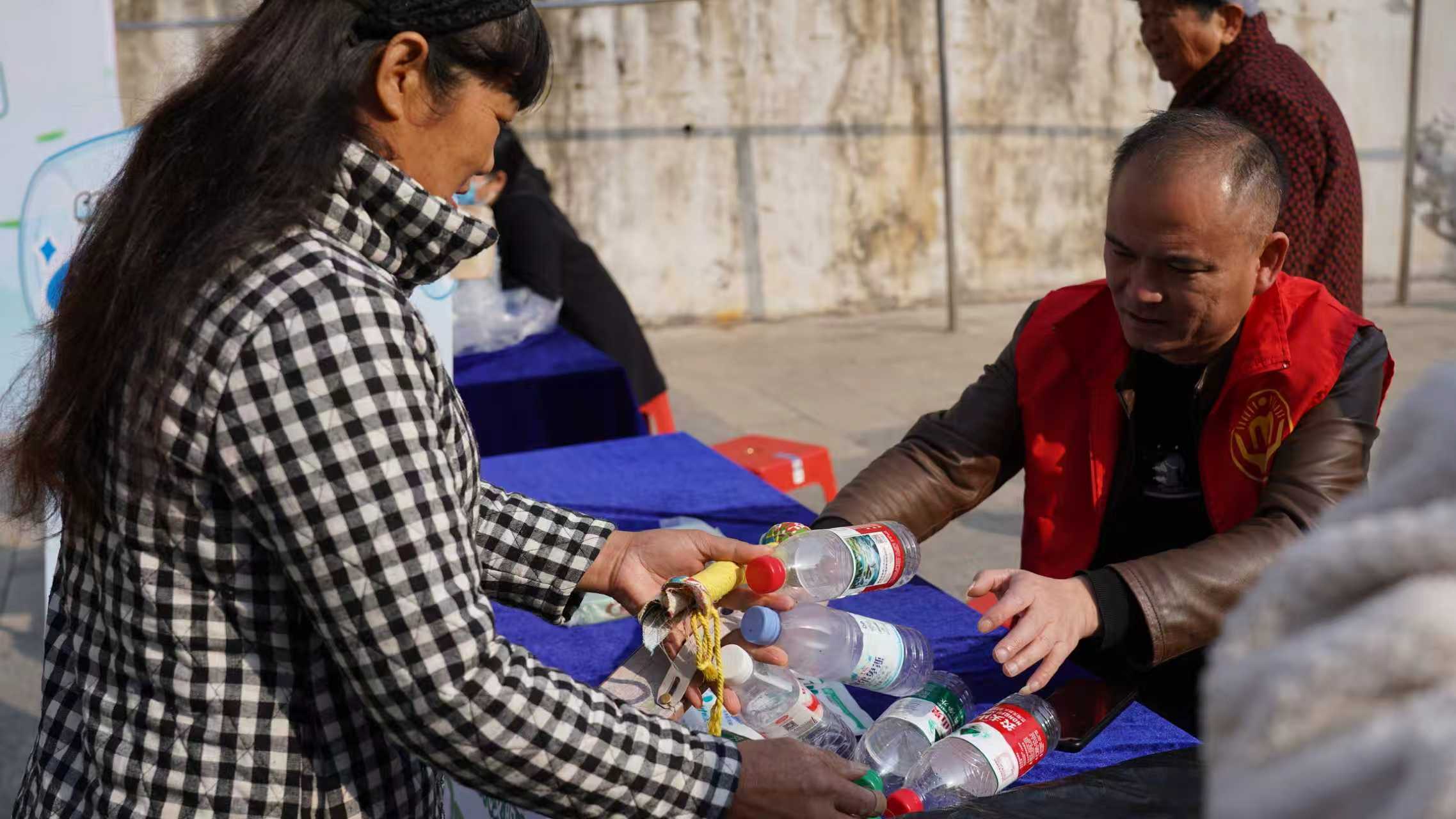 在“‘瓶’什么都给我”摊位前,居民们拎着废旧塑料瓶有序排队兑换实用生活用品,用实际行动践行绿色生活理念,有趣又实在。