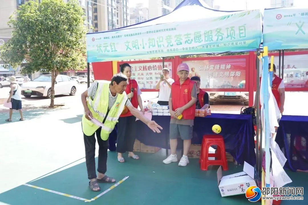 板铺社区“文明伴我行知识问答”区,志愿者将食品安全、防溺水、防火灾等夏日安全知识融入游戏,吸引了众多居民参与。居民一边参与投篮游戏、一边答题,在游戏中了解到了安全的重要性。