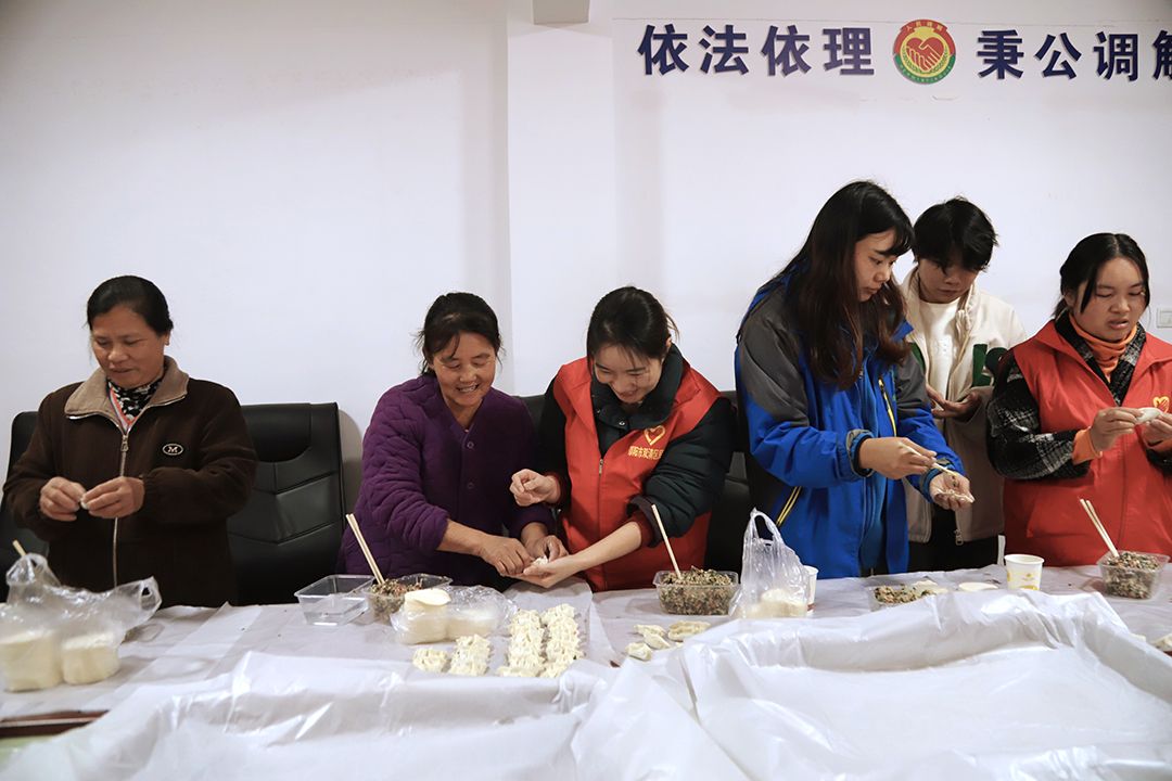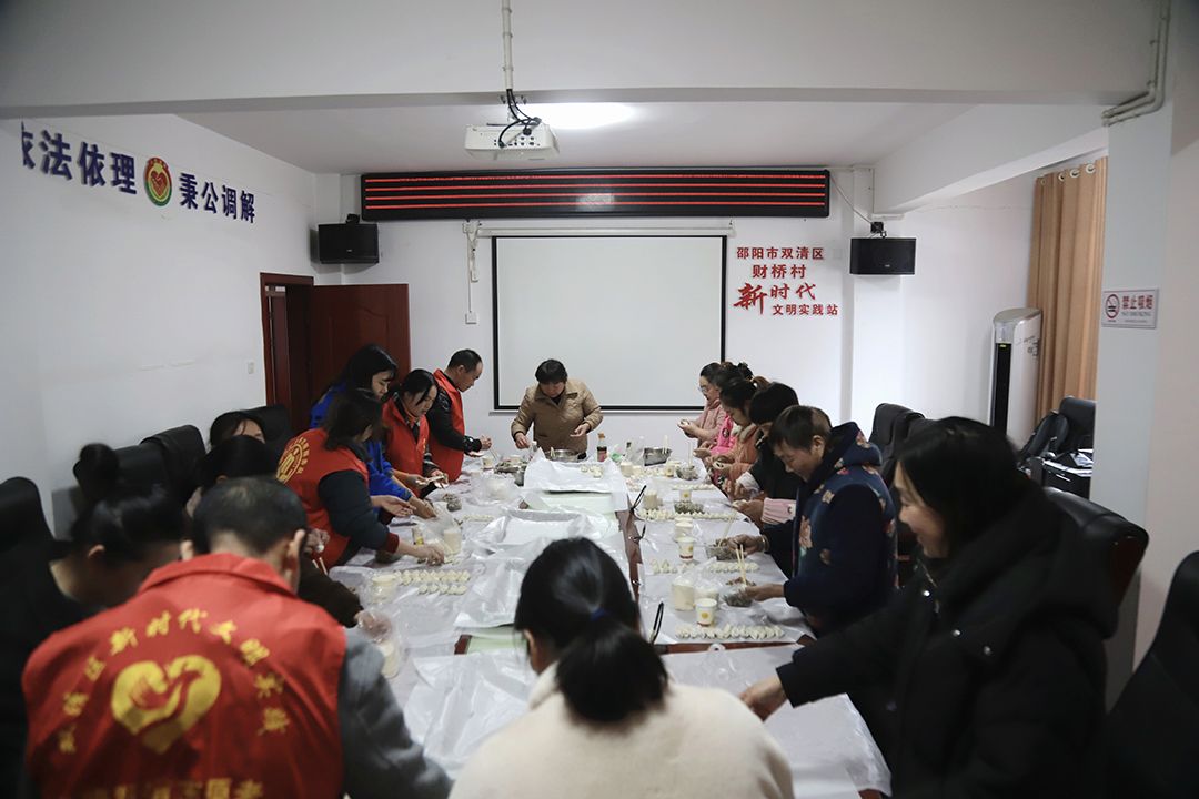 活动现场,财桥村新时代文明实践站热闹非凡。工作人员、志愿者以及村民们齐聚一堂,大家围在一起,热热闹闹地包起了饺子。桌面上摆放着各式各样的饺子皮、馅料,氛围温馨而欢乐。
