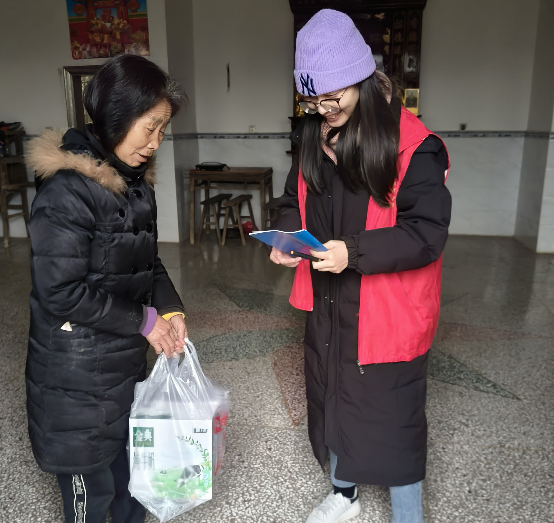 当天上午,志愿者们自发准备好为结对帮扶对象准备的慰问品,志愿者小申说,上回听李爷爷说自己牙口都不大好了,所以特意准备了面条、面粉这些容易消化的食品,还有一些生活用品。其他志愿者也纷纷准备了老人们需要的东西。在老人家中,志愿者们细心询问老人身体状况,帮忙整理房间、检查用电安全、更是手持扫帚为老人们打扫门前屋后等卫生。