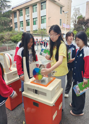 随后,科普团队走进新邵二中,开展科普进校园活动。志愿者们通过科普器材展示、原理讲解、互动体验等形式,带领学生“零距离”感受科技魅力。现场设置了多个展区,学生们争相试用器材,动手操作,直观理解物理、化学原理。志愿者还结合器材演示,引导学生思考科学原理在生活中的应用,鼓励他们树立“学科学、爱科学、用科学”的志向,争做科技强国的生力军。